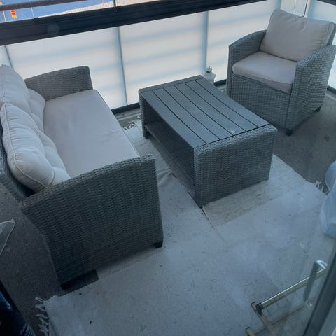 Sisältää kaksi valkoiseksi maalattua eurolavaa ja samankokoisen pehmusteen. Lisäksi kaupan päälle saa 2kpl ekstrapehmustetta (yksi on tuollainen 120x80 ja yksi ns. selkänoja n.40x120cm), jotka ovat enemmän huolenpitoa vailla. Tekstiilipesurilla saa varmasti oikein hyvät vielä! Huom. Olleet lasittamattomalla, mutta katetulla parvekkeella.