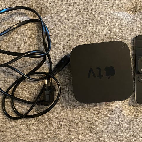 Apple Apple TV mediatoistin mustassa värissä. Laite sisältää HDMI-liitännän ja virtaliitäntäkaapeli. Käytettävissä kotiviihteeseen videoiden ja muiden median toistamiseen.