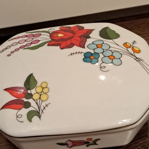 Vintage posliini sydämenmuotoinen rasia, jossa kukkakuvio ja kullattu koriste.