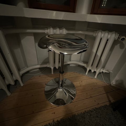 Myydään metallinen baarijakkara, istuinosa on nahkaa.