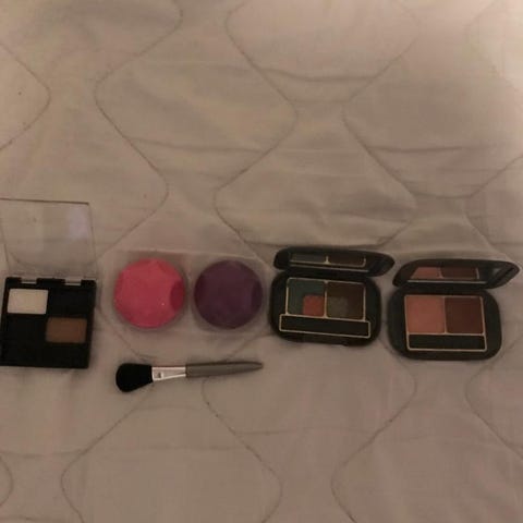 W7 Duo Blusher poskipuna kahdessa sävyssä. W7 Press Impress luomiväripaletti sisältää useita kimaltavia värejä. Carmex huulirasva kosteuttava ja suojaava, kirsikan maku. Kaikki käyttämättömiä