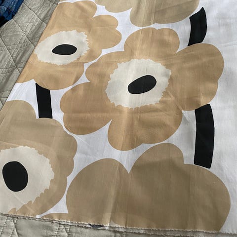 Marimekko Unikko collegekangas, jossa on beige-valkoinen kukkakuosi. Kangas on paksua ja kuvioitu, sopii esimerkiksi collegehupparin/ paidan ompeluun tai sisustuskäyttöön esim päiväpeitteeksi