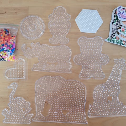 Ohjesivu repeytynyt ja hamahelmiä on käytetty. Niistä ei siis saa tehtyä täysin ohjeen mukaisia kuvioita.