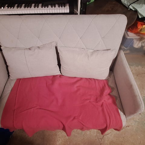 Annetaan ilmaiseksi kahden istuttava vuoteeksi levitettävä sohva. Kangaspäällysteinen, siisti. Kevyehkö, helposti kuljetettava.
