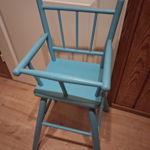 Puinen valkoinen syöttötuoli, jossa pehmuste