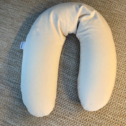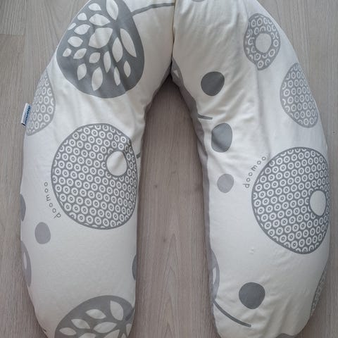 Vähälle käytölle jäänyt Doomoo Buddy imetystyyny. Täytettä tyynyssä on hyvin edelleen, ei ole siis vielä tarvetta hankkia lisää. Tummanharmaa päällinen oikein siistissä kunnossa, sen saa irrotettua pesuun.