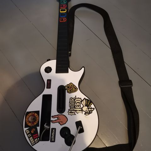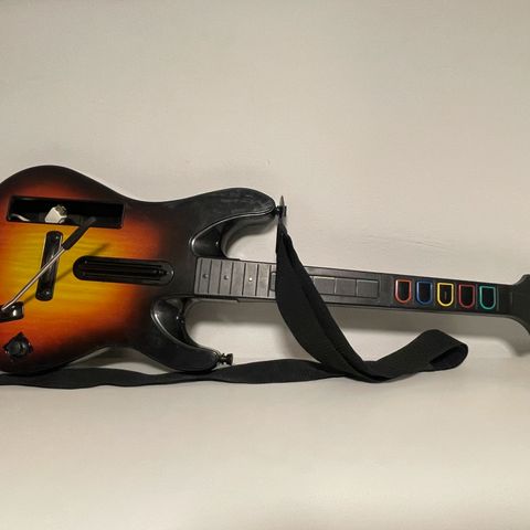 Hyvässä kunnossa, sisältää lähettimenä tarpeellisen Wiimoten. Ei tarvitse vastaanotinta, toimii Bluetoothilla. Voi käyttää esim. Windows-koneella WiitarThingin kautta Cloneherossa, mahdollisesti muuallakin.