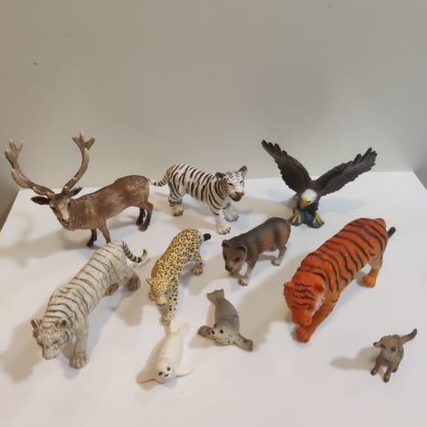 Myynnissä 28 Schleich figuuria, eniten koiria mutta myös muita eläimiä. Ostettu vuosina 2005-2009. Eivät uudessa kunnossa kun lapsena leikitty.