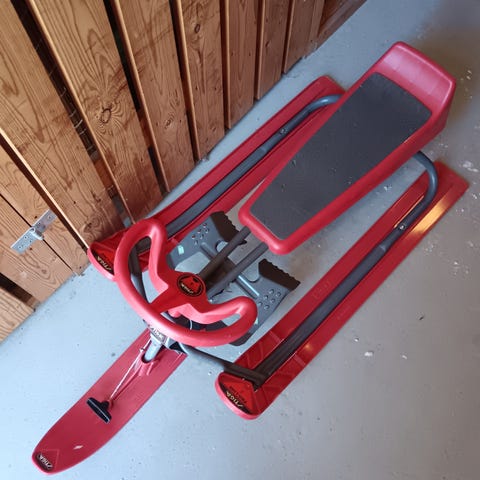 KHW Snow Racer kelkka, väriltään musta ja keltainen. Kelkan runko on valmistettu kestävästä materiaalista ja siinä on ohjauspyörä sekä istuin. Sopii talvikäyttöön lumisissa olosuhteissa.