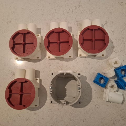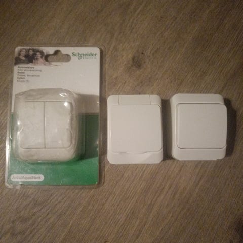 Kaksi kytkintä, kaksi kytkimen peitelevyä ja yksi pistorasian peitelevy.