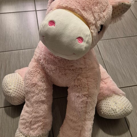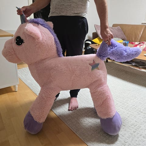 Hyväkuntoinen iso yksisarvispehmolelu. Vartalon pituus noin 45 cm ja korkeus etujalasta päähän noin 60 cm. Vain nouto Oulu Kaakkuri.