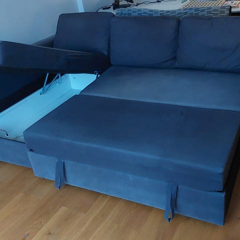 Sohva on hyväkuntoinen. Juuri pesty runkoa myöden. Runko on tukeva. Divaanin alla löytyy säilitystila. Savuttomasta asunnosta ( ei tupakoitu sisällä). Divaanin puolta voi vaihtaa. Mitat Leveys 230cm syvyys 85cm divaani 150cm vuode 140x200cm.