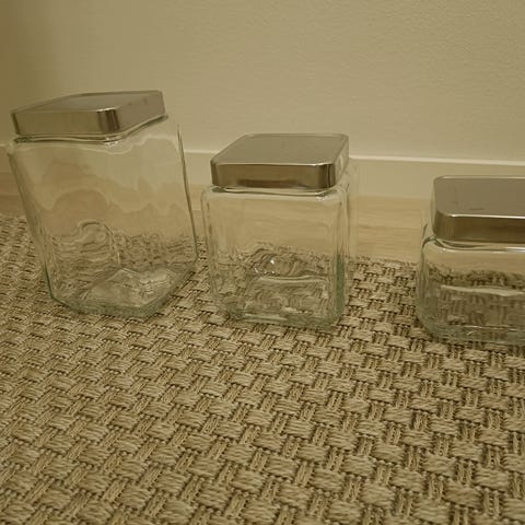 Lasipurkkisetti, joka sisältää kuusi erikokoista purkkia puisilla kansilla. Purkit soveltuvat esimerkiksi elintarvikkeiden säilytykseen. Materiaali lasi ja puu. 3 kpl 9,5x 21 cm sekä 3 kpl 9,5x16 cm.