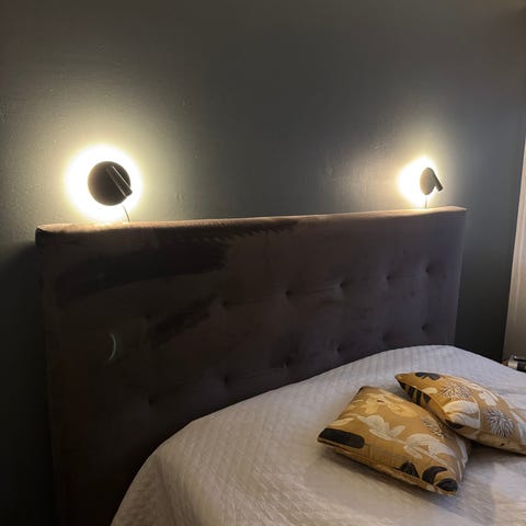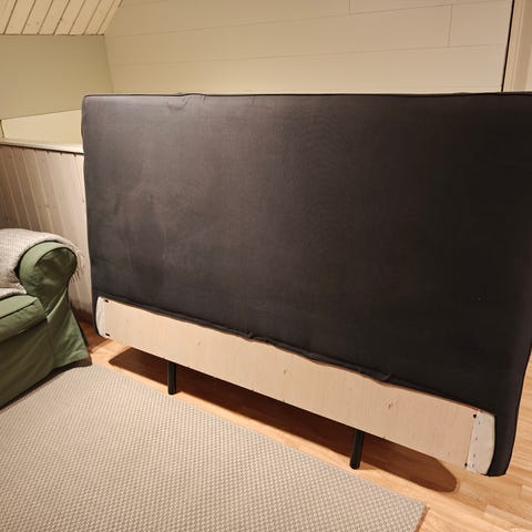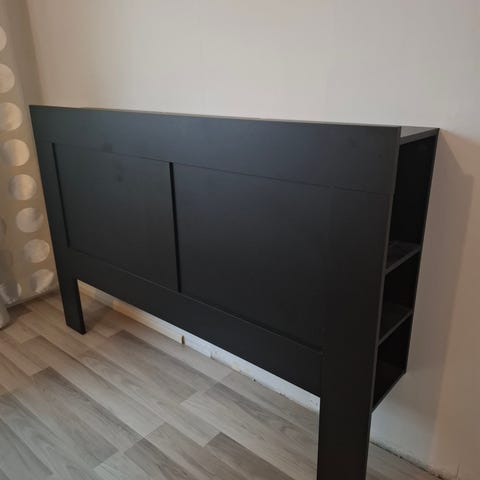 Kätevä sängyn pääty, jossa on sisään työnnettävä hyllykkö. Hyllykössä on pyörät alla.