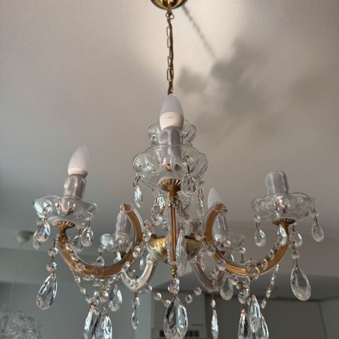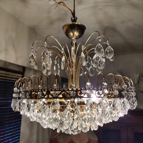 Tämä suuri vanha kristallivalaisin on pysäyttävän loistelias ja hieno. Lampussa 8 valopistettä ja sen halkaisija on peräti 70 cm. Messinkirunko on päällystetty lasilevyillä ja koristeltu pienillä lasikukkasilla. Valaisimessa riippuu lisäksi isoja kristalleja sekä keskellä kristallinen pallo.