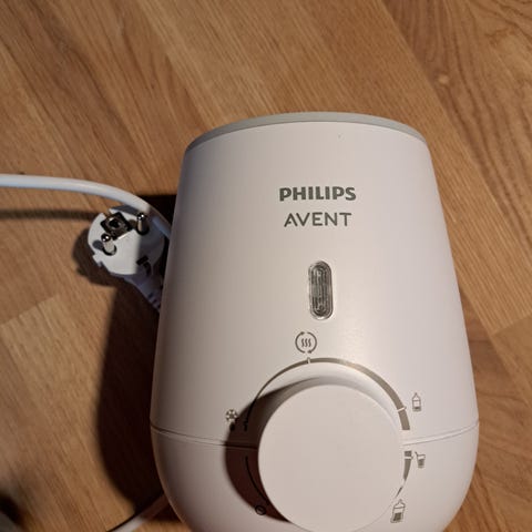 Philips Avent tuttipullon lämmitin, jossa on säädettävä lämpötila-asetus ja helppokäyttöinen pyörivä säätönuppi. Laite on suunniteltu tuttipullojen nopeaan ja tasalaatuiseen lämmitykseen.