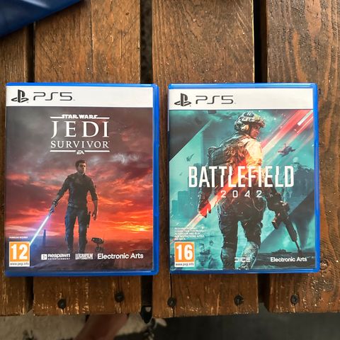 PlayStation 5 -pelit, sisältäen Way of the Hunter ja Battlefield 2042. Pelit ovat PS5-alustalle suunniteltuja ja sisältävät toiminta- ja seikkailuteemoja.