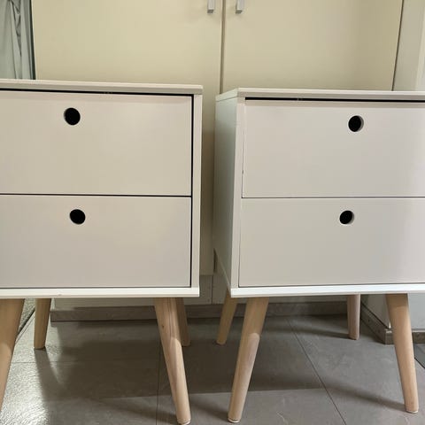 Myydään Jyskin Stenlille malliset valkoiset yöpöydät puunvärisellä kannella uusien yöpöytien tieltä.