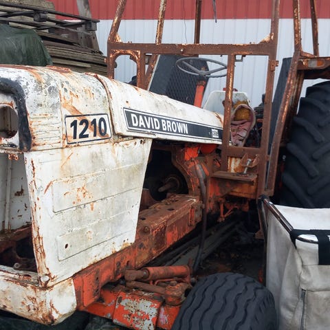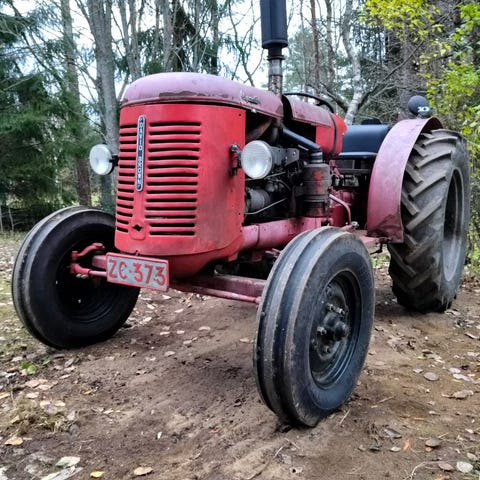 David Brown 990 traktori ja puutavaran perävaunu. Traktorissa on punainen väri ja se soveltuu maatalous- ja metsätöihin. Mukana puutavaran kuljetukseen tarkoitettu perävaunu, jossa on ketjut ja moottorisaha kiinnitettynä.