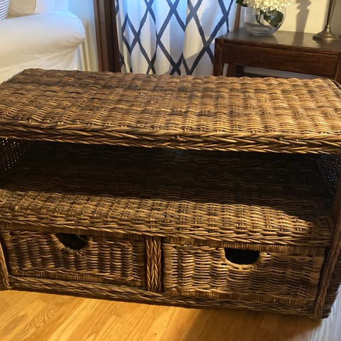 Pyöreä kaappi, rottinkipintaiset ovet ja yksi kiinteä hylly sisällä. Materiaalit MDF, puu ja rottinki.