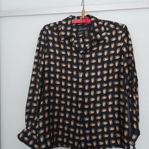 Höyhenenkevyt kuviollinen silkkipusero. Puoliksi läpikuultava. Hihansuissa ja vyötärökaitaleessa napit. Mitat kuvissa.