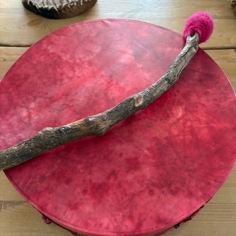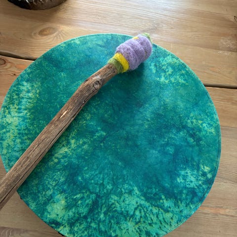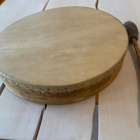 Pieni, n. 20cm korkea, poronnahasta valmistettu rumpu. Hieno terävä kumea sointi. Sisustuselementiksi tai shamaanirummuksi.
