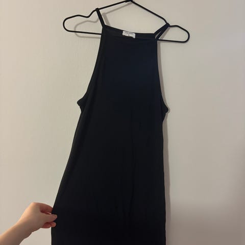 Kaunis ja käytännöllinen pikkumusta joustavaa kangasta/neulosta. Helmaosassa asymmetrinen päälliosa. Mitat kuvissa.