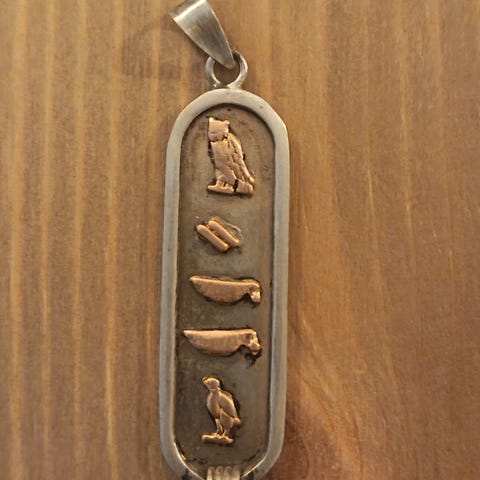 Egyptiläistyylinen riipus noin 53 mm. Siniset helmet noin 38 cm, raidalliset akaattimaiset kuviot. Paino noin 21 g. Korun voi pujottaa riipukseksi ohueen kaulaketjuun niin, että helmet roikkuvat pitkänä koristeena riipuksen takana, tai kietoa kaksin kerroin rannekoruksi. Vintagekoru, ei leimoja, lienee hopeoitua korumetallia eikä hopeaa. Helminauhassa ei ole lukkoa eli tarvitaan työkaluja, jos korut haluaa irrottaa.