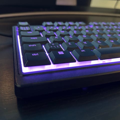 Practically new. This is a great keyboard for someone that is used to the Nordic key layout. Also it has lots of pretty lighting options. Comes with the original box and wrist pad.