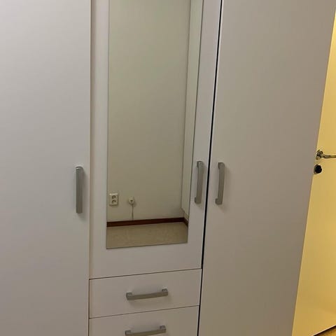 Hieno tukeva vaatekaappi kahdella liukuovella, kaksi ylähyllyä ja kaksi vaatetankoa, takalevy. Purettuna valmiiksi, kasausohjeet mukana, helppo kasata.