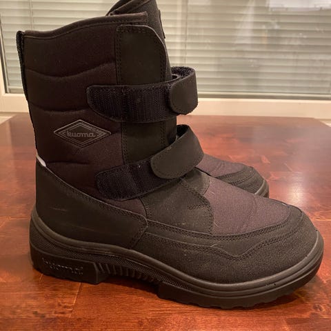 Toppasaappaat koko 41, musta väri. Kengät on suunniteltu talvikäyttöön ja niissä on pitävä pohja. Materiaalina on vettähylkivä kangas ja kestävä kumipohja. Sopivat muuhun käyttöön talviolosuhteissa.