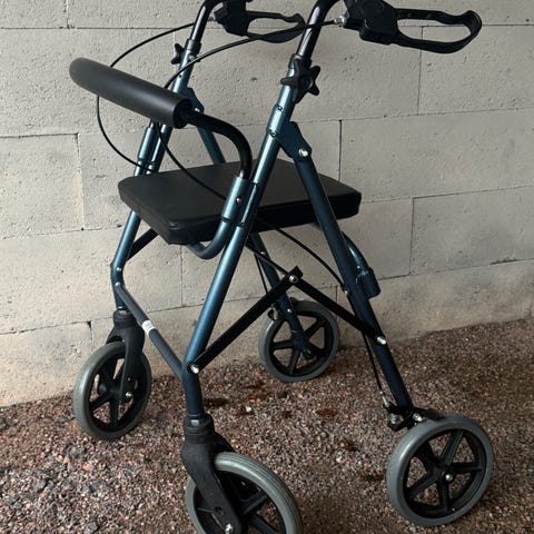 Sininen nelipyöräinen rollaattori, jossa on istuin ja kori. Rollaattorissa on neljä pyörää, tukevat kahvat ja istuinosio, joka mahdollistaa lepäämisen. Käytettävissä apuvälineenä liikkumisen tukena.