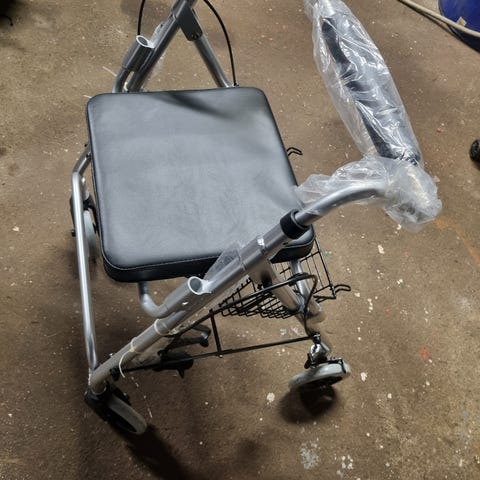 Sininen nelipyöräinen rollaattori istuimella ja korilla