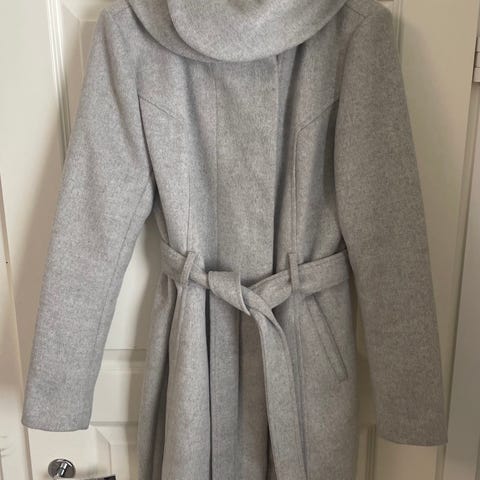 Käyttämättä jäänyt Tommi Hilfigerin vaaleanharmaa villakangastakki, pituus olalta helmaan 97cm, rinnanympärys 90cm, hihan pituus kainalosta 45cm.