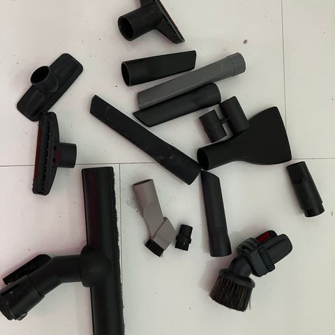 Hoover imuri, mukana useita lisävarusteita kuten erilaiset suuttimet ja jatkovarsi.