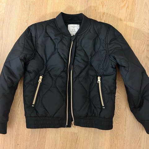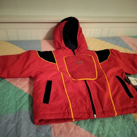 Käytetty kunto, vähän paikattukin hihoista ja hihat juurikin kuluneet. Kakkostakiksi hyvin kelpaa.