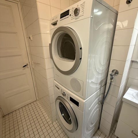 Alhaalla Bosch -merkkinen pyykinpesukone, ylhäällä Siemens -merkkinen kuivausrumpu.