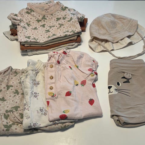 Vaatepaketti koossa 74. Kengät 20/21. Hyväkuntoisia. Yhden mekon toinen neppari kauluksesta irti, ei ole vaikuttanut käyttöön. Valkosissa sukkiksissa pieni siististi paikattu reikä. Huomioitu hinnassa.