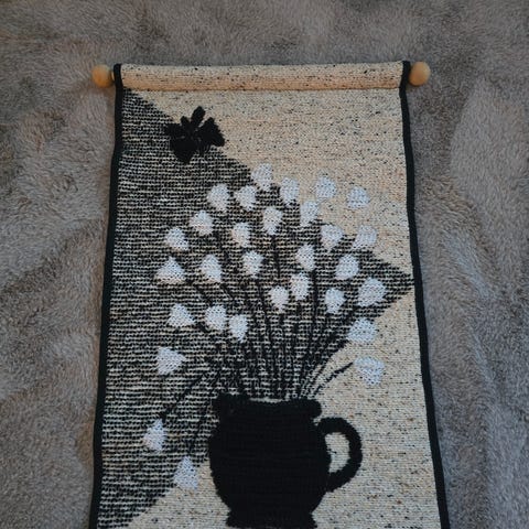 Hanhisalon kutomon hyväkuntoinen tupasvilla raanu. Pituus 60 cm, leveys 40 cm (puisten kannattimien kans 47 cm).