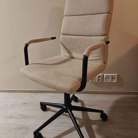 Vekestä ostettu Nolin työtuoli. Korkeutta voi säätää ja toimivat renkaat.