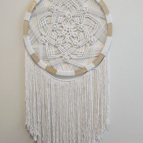Okran värinen Macrame seinäkoriste halkaisija 65cm ja pituus 100cm.