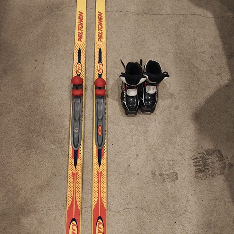 Peltonen Classic hiihtosukset punaisella ja keltaisella värityksellä. Mukana mustat sauvat 118cm ja punamustat naisten monot 39. Soveltuu perinteiseen hiihtotyyliin.
