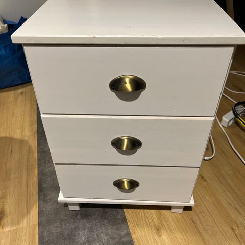 Yöpöytä jalallisella laatikolla valkoinen ja puunvärinen