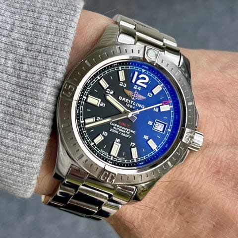 Breitling - Chronomat 44 Chronograph Automatic - AB0110Kast: EdelstaalKellon koneisto: Sveitsissä valmistettu automaattinen Breitling Caliber B01Wijzerplaat: mustaLäpimitta: 44 mm (ilman kruunua)Lasi: safiirilasiHihna: alkuperäinen ruostumattoman teräksen Breitling-hihnaRannes koko: noin 20 cmKunto: 9/10 Huippukunto!Takuu: 1 vuosi 'de Horlogemeesters'Toimitetaan matkakotelossa + aitoustodistus "De Horlogemeestersiltä".Rekisteröity ja vakuutettu lähetys (DHL-express).