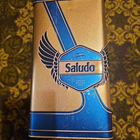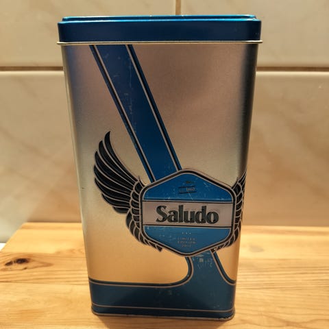 Myydään kuvien mukaisessa kunnossa oleva Saludo limited edition 2012 kahvipurkki purkki säilytys rasia