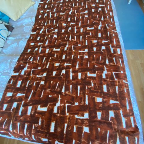 Ruotsalaisen Borås Wäfverin käyttämätön kangas, suunnittelija Camilla Fürst, pituus 7,85 m, leveys 150 m, 100% puuvillaa, lakanakankaan vahvuista, värit valkoinen, punainen, vaaleansininen, tummemman sininen ja vihreä.