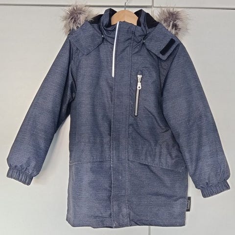 Oikein hyvässä kunnossa oleva Lassie - merkkinen, lämmin ja hieman pidempi toppatakki, koko 122, irroitettava huppu ja kiristys vyötäröllä. vaaleimmissa kohdissa haaleita tahroja, muutoin ei moitetta.