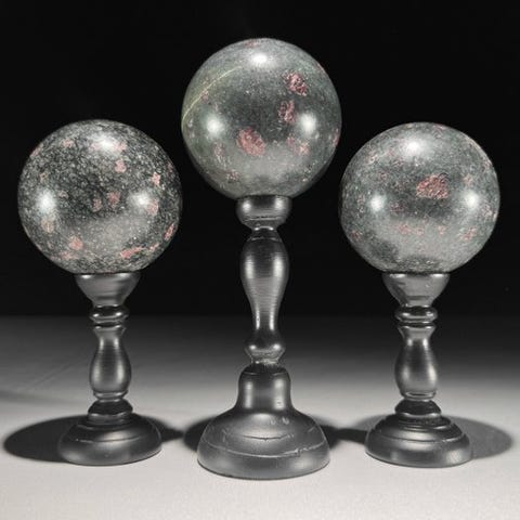 Upea setti kolmesta kiillotetusta Ruby Zoisite -pallosta räätälöidyissä telineissä.Ruby Zoisite tunnetaan myös nimellä Ruby in Zoisite tai Anyolite. Se on kivi, joka on erinomainen yhdistelmä energiaa ja väriä, tehden siitä yhden jaloimmista ja upeimmista kivistä kaikista kivistä.Anyolite on nimi, joka kuvaa luonnollista yhdistelmää vihreästä Zoisite-kivestä ja rubiini-kivestä.Zoisite on kirkas keskivihreä, jonka näet kiven sisällä, ja se yhdistyy täydellisesti Ruby-kiven syvän magentanpunaisen kanssa.Ruby Zoisite sisältää usein mustia Tschermakite-alueita, jotka näkyvät myös kivessä.Noin mitat, mukaan lukien jalusta:Pallo-kivi 1: Korkeus 17,6 cm, Ø 6,7 cmSphere stone 2: Korkeus 14,2 cm Halkaisija 6,7 cmSphere stone 3: Korkeus 14,5 cm, halkaisija 7 cmVastuuvapautukset:Ole hyvä ja huomioi, että nämä kuvat on otettu pimeässä studiolla, ja värit voivat vaihdella ympäristön mukaan.> MAINITTU PAINO SISÄLTÄÄ PAKKAUSMATERIAALIN.LähetyksetTuote lähetetään seurantanumerolla DHL Parcelin, DPD:n tai postNl:n kautta. Seuranta päivittyy Catawiki-luettelossasi, kun pakettisi on jätetty postiin.Tarkista säännöllisesti välttääksesi pakettisi palauttamisen meille, jolloin ostaja vastaa toisen lähetyksen toimituskuluista.Seuranta Espanjaan ja Portugaliin: käytä tätä linkkiä ja lisää Catawiki-lotistasi saatu seurantanumero.https://clientesparcel.dhl.es/LiveTracking/HomeME EMME YHDISTÄ TOIMITUKSIA!!!-Jos sinulla on kysyttävää lähetyksestäsi, ota meihin yhteyttä Catawiki-viestipalvelun kautta. Pyrimme vastaamaan kolmeen työpäivään kuluessa.