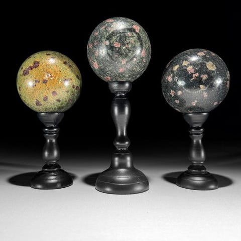 Kaunis kiillotettu setti kolmesta pallosta, jotka on valmistettu ruby zoisite -kivestä, ja asetettu räätälöityihin telineisiin.Ruby Zoisite tunnetaan myös nimellä Ruby in Zoisite tai Anyolite. Se on kivi, joka on erinomainen yhdistelmä energiaa ja väriä, tehden siitä yhden jaloimmista ja upeimmista kivistä kaikista kivistä.Anyolite on nimi, joka kuvaa luonnollista yhdistelmää vihreästä Zoisite-kivestä ja rubiini-kivestä.Zoisite on kirkas keskivihreä, jonka näet kiven sisällä, ja se yhdistyy täydellisesti Ruby-kiven syvän magentanpunaisen kanssa.Ruby Zoisite sisältää usein mustia Tschermakite-alueita, jotka näkyvät myös kivessä.Noin mitat, mukaan lukien jalusta:Pallokivi 1: Korkeus 17,6 cm Halkaisija 6,9 cmSphere stone 2 : Korkeus 14,4 cm Halkaisija 6,9 cmSphere stone 3: Korkeus 14,4 cm, halkaisija 6,9 cmVastuuvapauslausekeOle hyvä ja huomaa, että nämä kuvat on otettu pimeässä studiolla; värit voivat vaihdella ympäristön mukaan.> MAINITTU PAINO SISÄLTÄÄ PAKKAUSMATERIAALIN.LähetysKohde lähetetään seurantanumerolla DHL Parcelin, DPD:n tai postNlin kautta. Seuranta päivittyy Catawiki-luettelossasi, kun pakettisi on jätetty postiin.Ole hyvä ja tarkista säännöllisesti välttääksesi pakettisi palautumisen meille, jolloin ostaja vastaa toisen lähetyksen toimituskuluista.Seurantaan Espanjaan ja Portugaliin käytä tätä linkkiä ja lisää Catawiki-erästäsi saatu seurantanumero.https://clientesparcel.dhl.es/LiveTracking/HomeEMME YHDISTÄ TOIMITUKSIA!!!- Jos sinulla on kysyttävää paketistasi, ota yhteyttä meihin Catawiki-viestipalvelun kautta. Yritämme vastata kolmen työpäivän kuluessa.