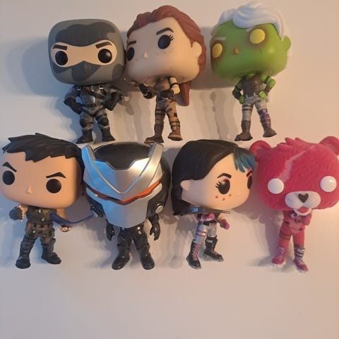 Funko Pop Fortnite hahmolelut, yhteensä 7 kappaletta. Mukana erilaisia hahmoja pelistä Fortnite. Laatikot puuttuu, muutamasta on pahvi. Hinta 6€/kpl tai kaikki yht.28€